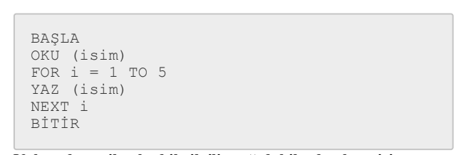 #1. BAŞLA OKU (isim) FOR i = 1 TO 5 YAZ (isim) NEXT i BİTİR Yukarıda verilen kod ile ilgili aşağıdakilerden hangisi yanlıştır?