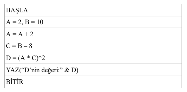 #2. BAŞLA A = 2 B = 10 A = A + 2 C = B – 8 D = (A * C)^2 YAZ(“D’nin değeri:” & D) BİTİR Yukarıdaki kaba kodda basit aritmetik işlemler yapılmaktadır. Aşağıdaki seçeneklerin hangisinde ekrana yazdırılan çıktı doğru olarak verilmiştir?