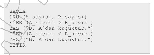 #7. BAŞLA OKU (A_sayısı B_sayısı) EĞER (A_sayısı büyüktür B_sayısı) YAZ (“B A’dan küçüktür.”) EĞER (A_sayısı küçüktür B_sayısı) YAZ (“B A’dan büyüktür.”) BİTİR Yukarıdaki kaba koda göre A_sayısı=10 B_sayısı=50 olduğu durumda aşağıdaki çıktılardan hangisi elde edilir?