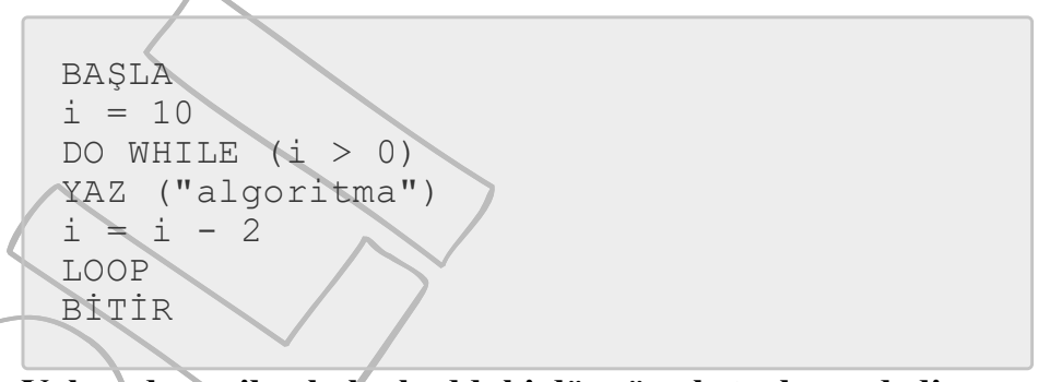#13. BAŞLA i = 10 DO WHILE (i büyüktür 0) YAZ (“algoritma”) i = i – 2 LOOP BİTİR Yukarıda verilen kaba koddaki döngü çalıştırılma adedi aşağıdakilerden hangisidir?